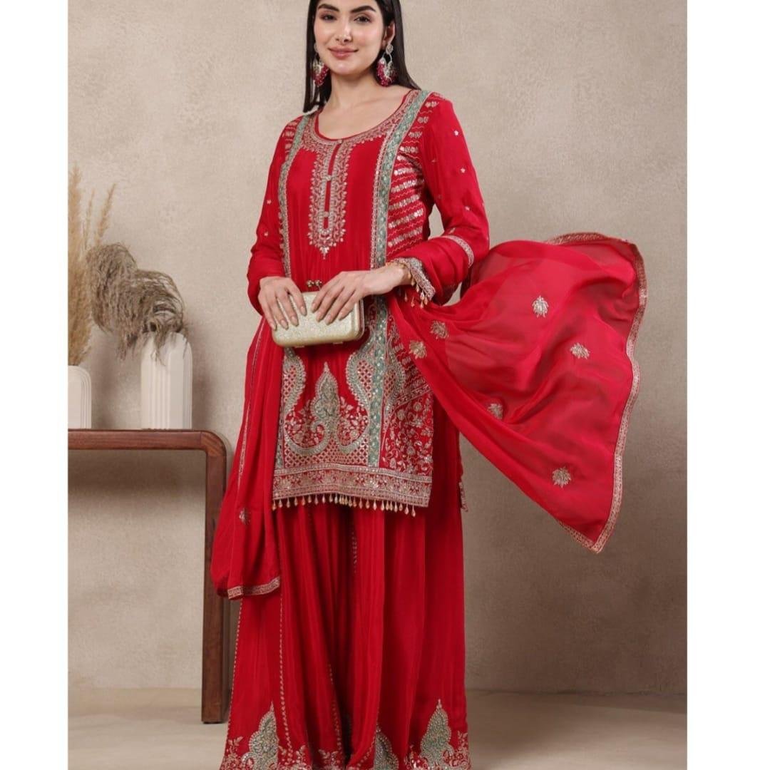 ✅ Available Sizes: M(38) | L(40) | XL(42) | 2XL(44) ✅ Top Length: 36–37 inches | Sharara Palazzo Length: 40–41 inches ✅ Dupatta Length: 2.10 Mtr ✅ Fabric: Heavy Chinon Silk with Micro Cotton Inner ✅ Package Contains: Top + Sharara Palazzo + Dupatta ✅ Weight: 900g