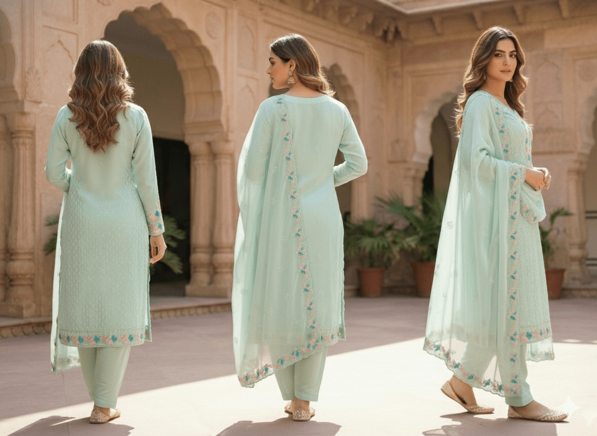 Shop elegant mint green embroidered kurta set with matching dupatta. Perfect for festive, party & daily ethnic wear. Premium fabric at best price.