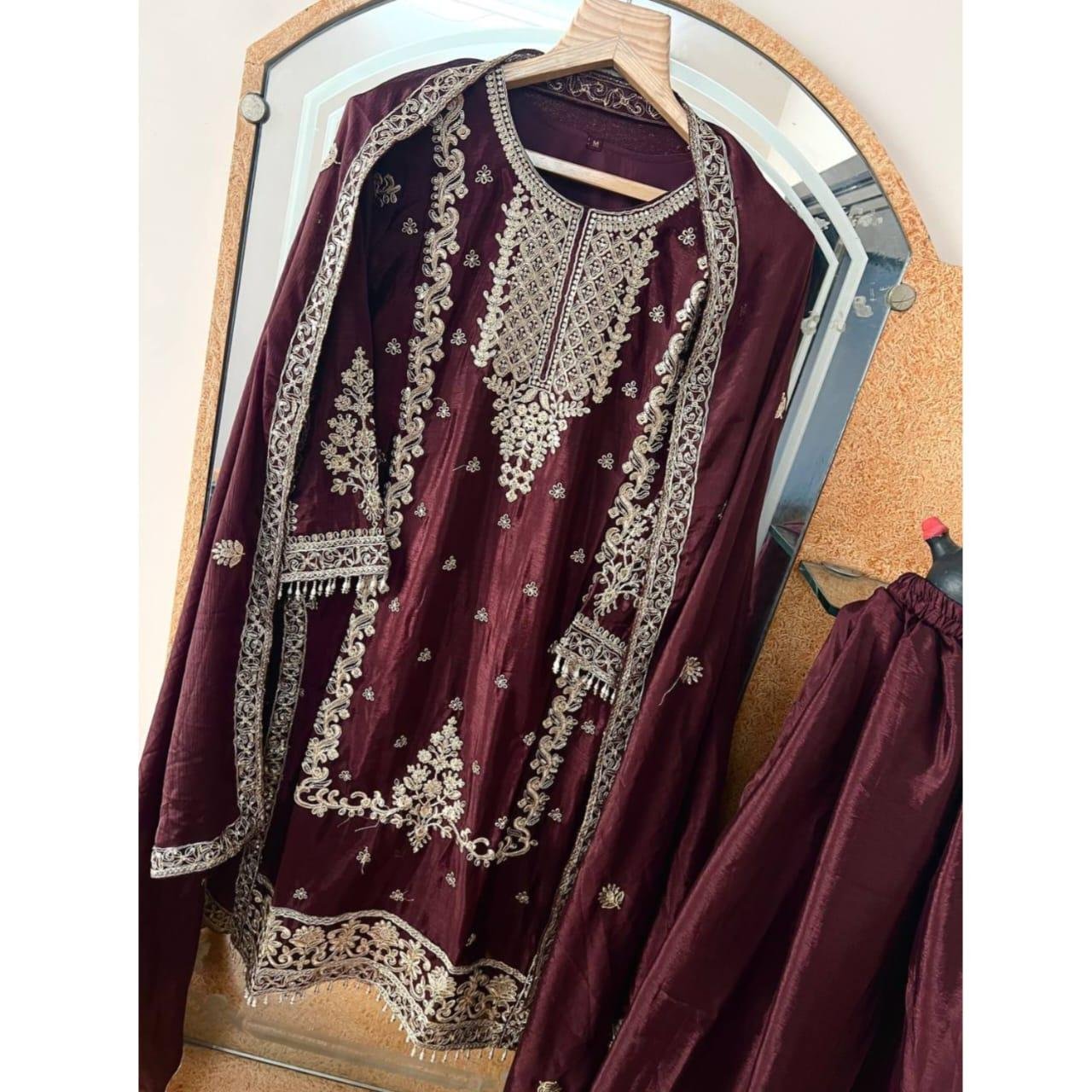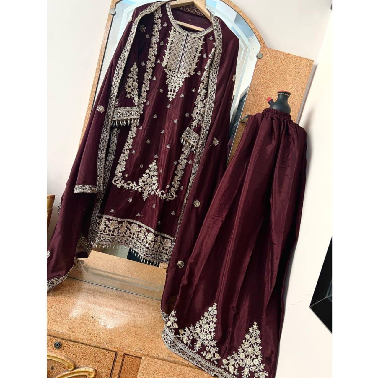 Pure Chinon Silk Fabric With Micro silk inner with Multi needle Embroidery Work(Fully stitched)