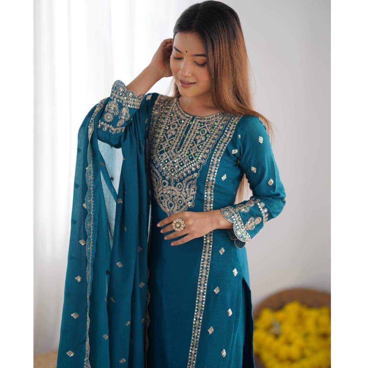 हेवी चिनॉन सिल्क से बना है, जिसमें खूबसूरत कढ़ाई, सीक्वेंस और असली मिरर खटली वर्क किया गया है। फुली स्टिच्ड टॉप, बॉटम और दुपट्टा इसे परफेक्ट एथनिक लुक देते हैं। आरामदायक माइक्रो कॉटन इनर और शानदार डिज़ाइन इसे किसी भी खास मौके के लिए बेहतरीन बनाते हैं।
